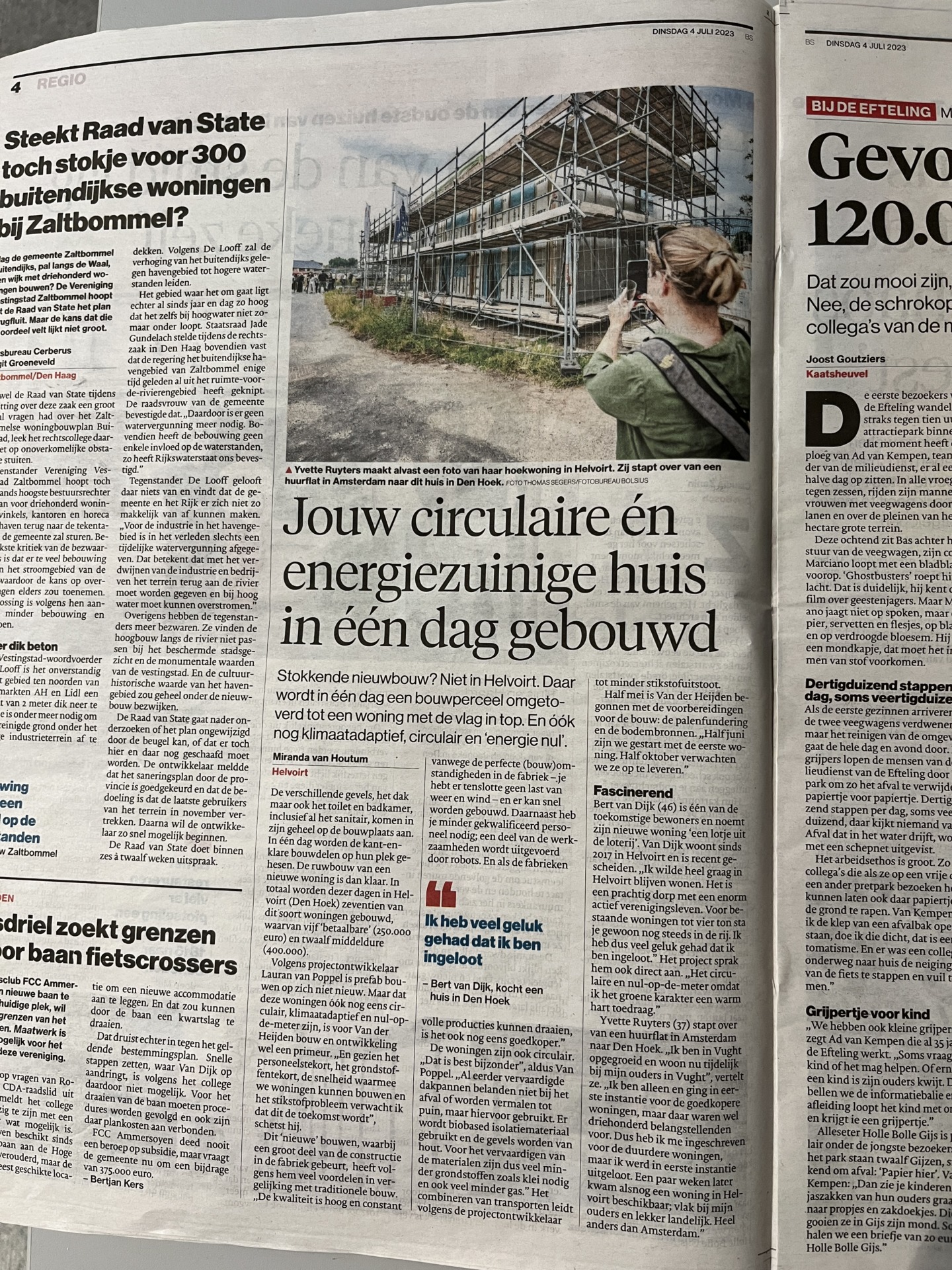 Buren ontmoetten buren. Zij werden door wethouder Yvonne Vos welkom geheten. De wethouder toonde zich zeer verheugd met dit project, vooral ook door alle voordelen die aan dit project ten grondslag liggen. “Er is een grote woningbehoefte. Voor jullie gaat dit een echt thuis worden. Hier kunnen we als gemeente bouwen in deze mooie omgeving. En de huizen staan er binnen een zucht.” Dit leverde de wethouder een groot applaus op. “De korte bouwtijd, de aantrekkelijke prijzen en de duurzaamheid van de woningen passen naadloos in de gemeentelijke ambities.” Zij noemde Van der Heijden de meest circulaire bouwer. Van der Heijden is verkozen uit 20 kandidaten voor deze aanbesteding.
