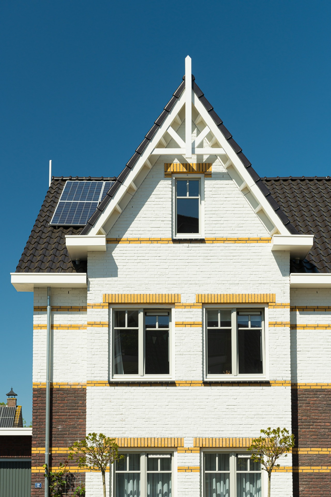 Het dak is gemaakt van circulaire bitumineuze dakbedekking (citumen). Om zo het elektra verbruik te verminderen plaatsten we op het dak 3 zonnepanelen voor ieder appartement.